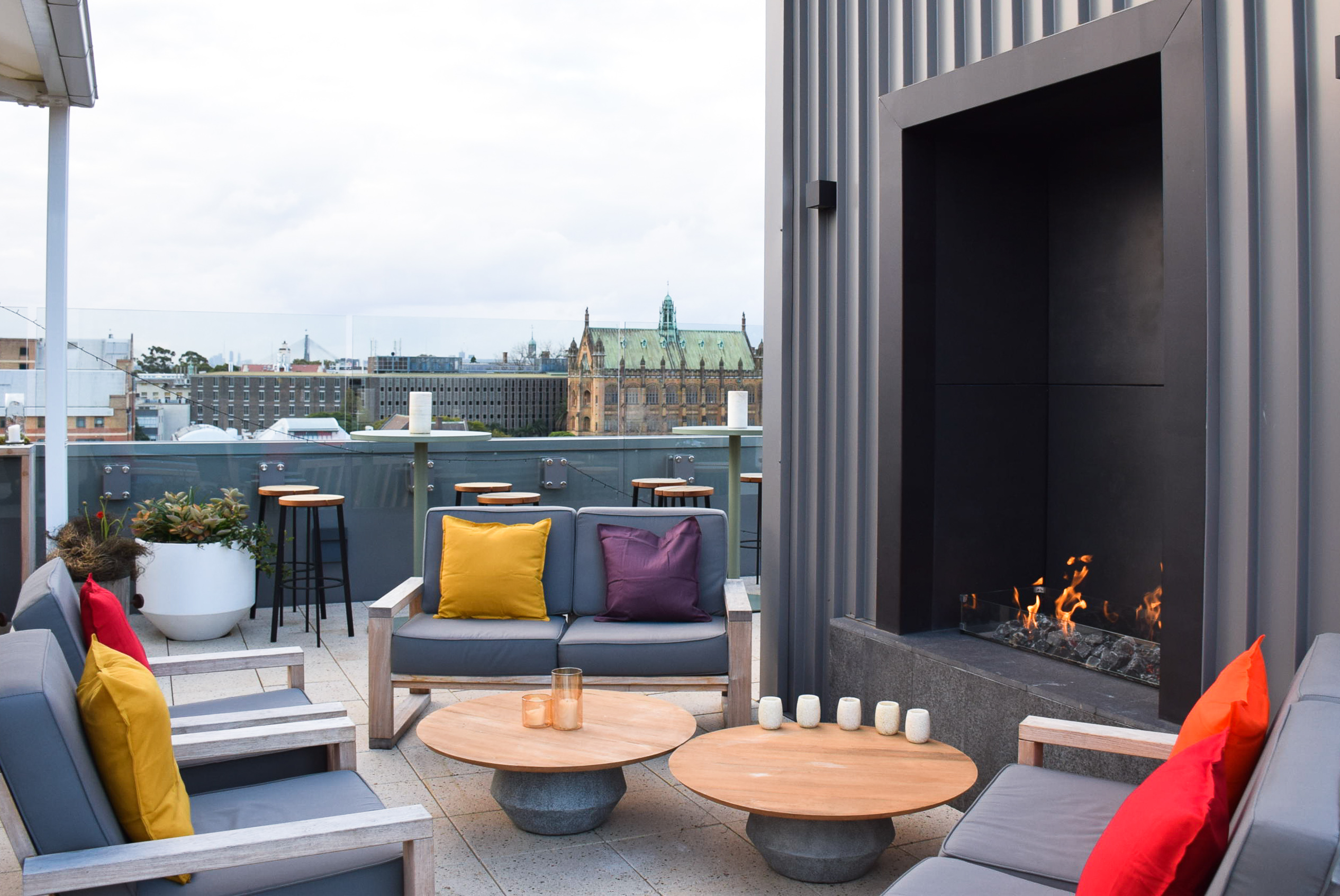The large Lee Common Room for members of Graduate House sits atop the McMillan Building. The adjoining Rooftop Terrace offers unparalleled views of the University and city beyond. Both spaces are popular venues for social events. The terrace boasts a large barbecue, an outdoor fireplace, casual seating and dining area.
